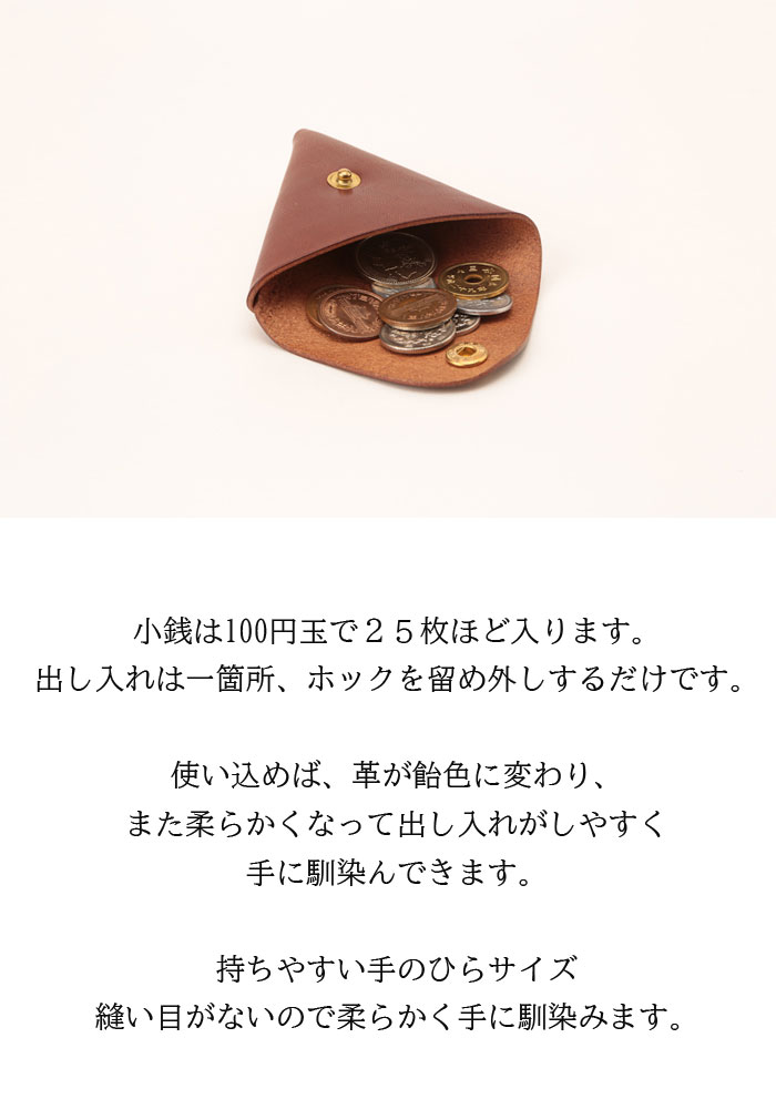 ホックとカシメの金具は真鍮使い込めば革と金具のエイジング効果を楽しめるマルチに活躍する革小物です 小銭は100円玉で25枚ほど入ります。